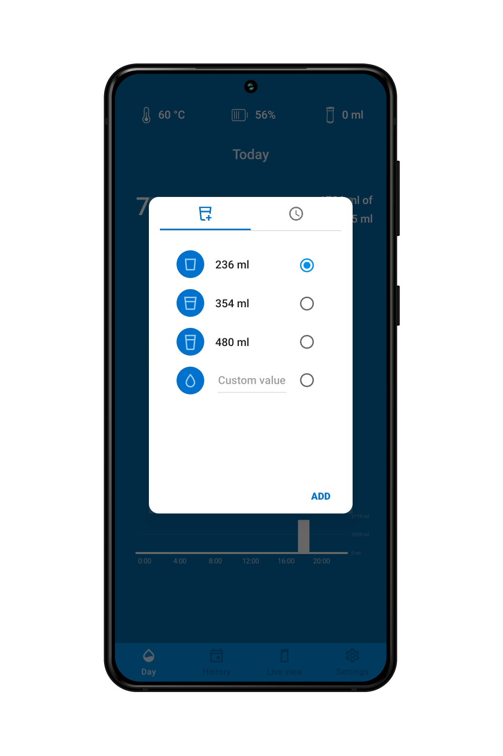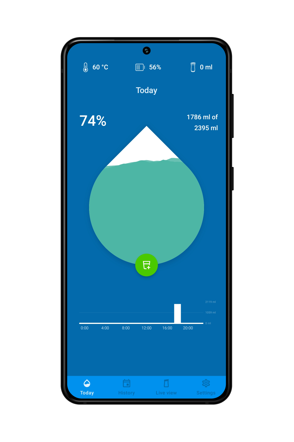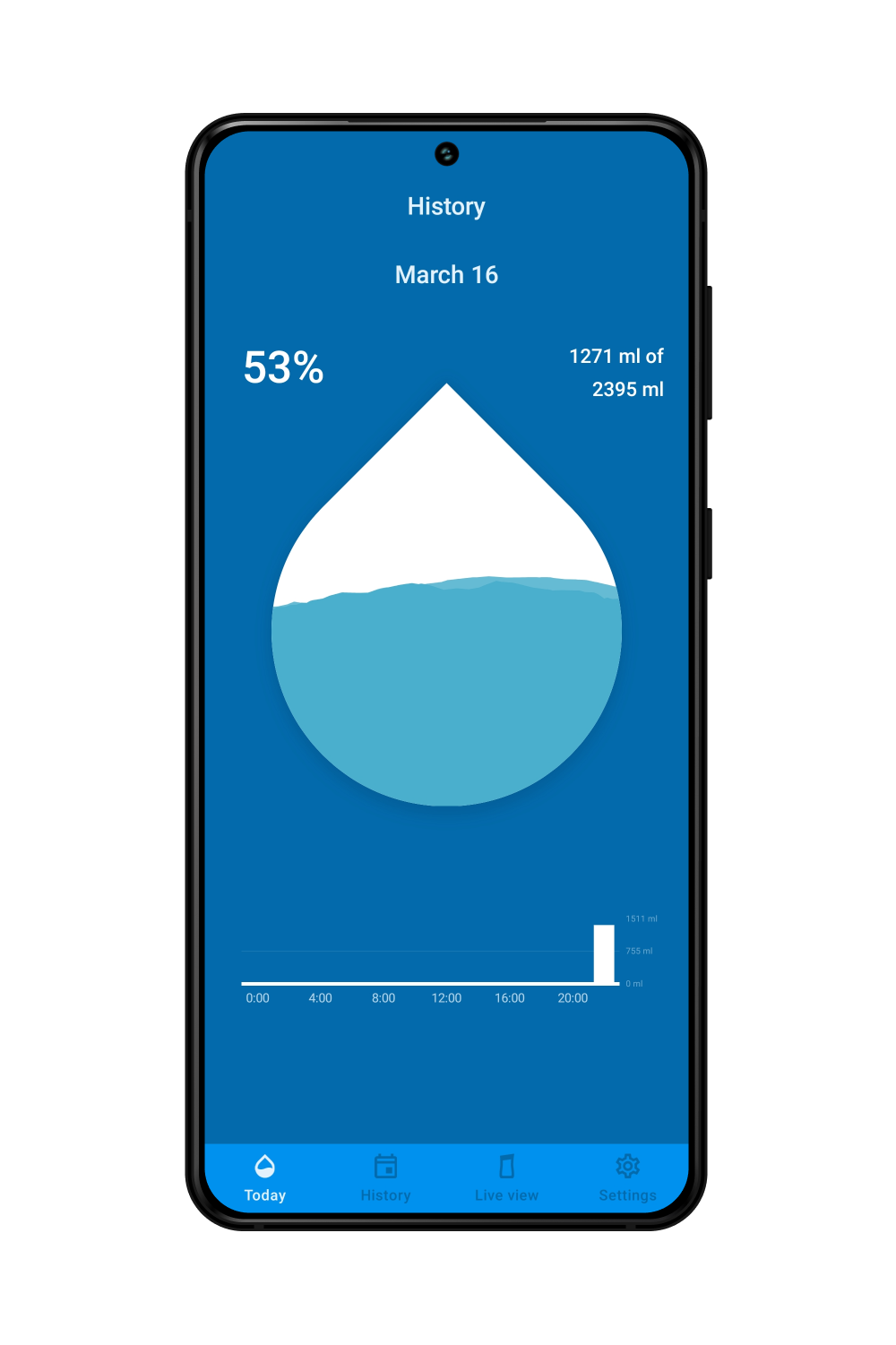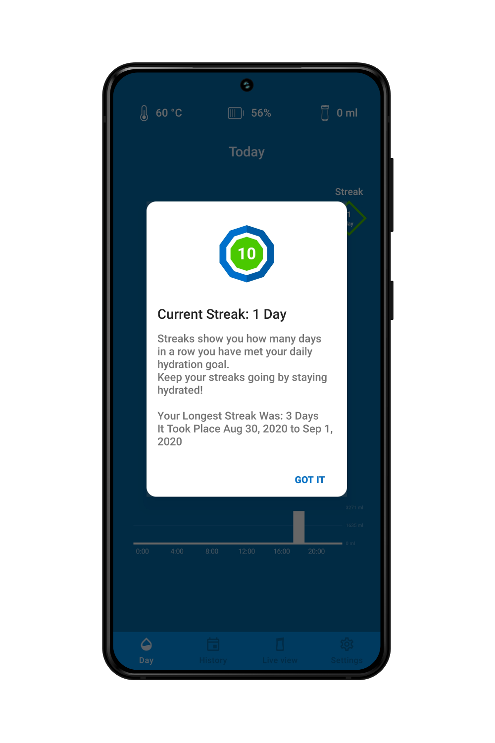 The application is interactive and easily lets you see your history from the past days, weeks or months. This information helps you better understand the effects water has on your body, mood, weight and energy.
